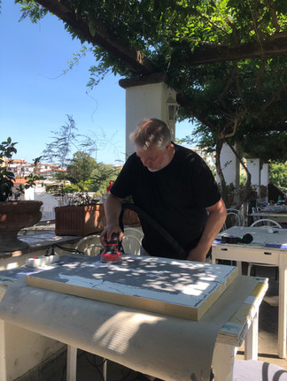 After that, I started working in the shade of the pergola's foliage, assembling my panels and applying filler. Drying was unexpectedly slow in the heat, but I eventually borrowed a heater, and it worked out fine. I produced three works during my stay.
